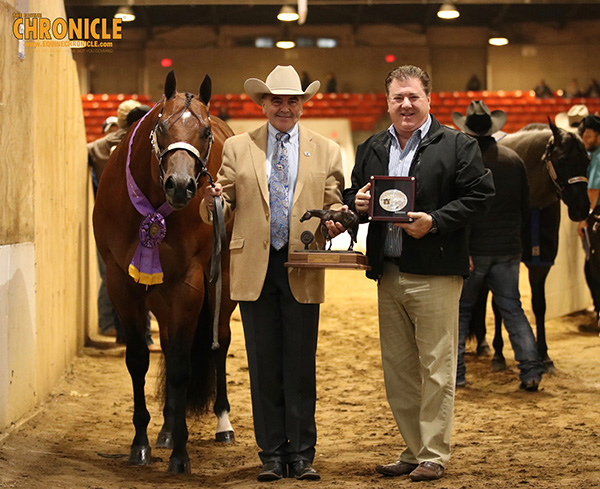 The Grand Champion Stallion was Evinceble, led by Tom Robertson for Scott D. Trahan. The Reserve Grand Champion Stallion was Intended To Be, led by Ross Roark for Ricardo Rejon.