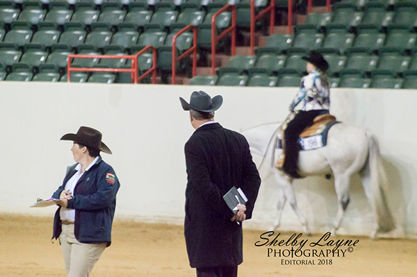The “spring” weather was not as expected as it was spitting rain and blowing wind up to 20 mph. One day, the wind chill was 16 degrees. It was a stark difference from the 70 and 80 degrees normally felt at Circle G. Luckily, Tunica Arena has a large indoor pen with heaters, so the exhibitors managed to get warm. Even with the cold weather and storms, the class sizes were great. The largest class of the show was the Amateur Ranch Riding with 24 and 20. There were also 20 in Open Ranch Riding, 17 in Amateur Reining, 17 teams in Amateur Sorting, and 15 teams in Open Sorting.