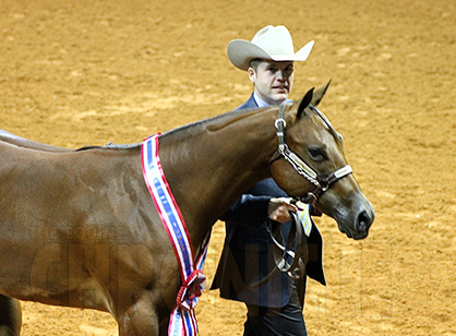 Those of you familiar with the myth of King Midas and his wish to have “the golden touch” will understand the perfect significance behind the name of Josh Weakly’s weanling colt, BPF Midas Touch. In this case, all “Midas” touched did turn into gold when he claimed a World Champion title, and appropriately a golden globe, this morning in Amateur Weanling Colts at the 2014 AQHA World Championship Show.