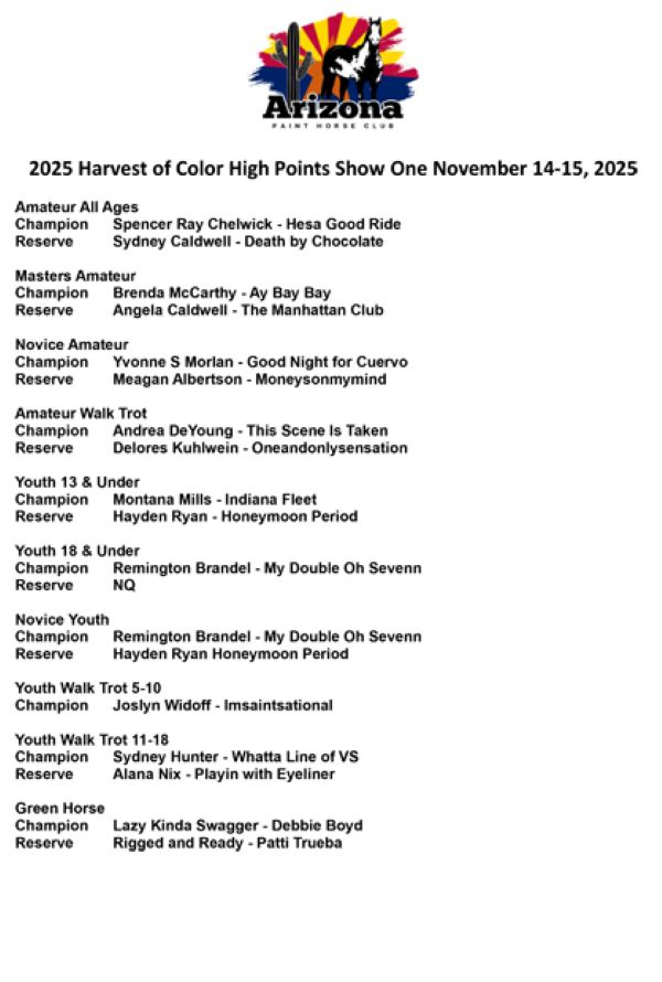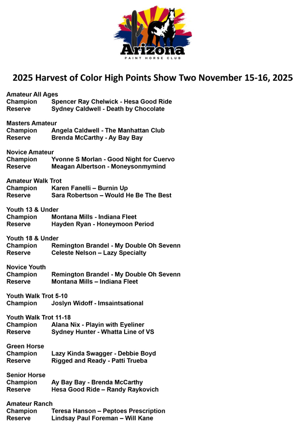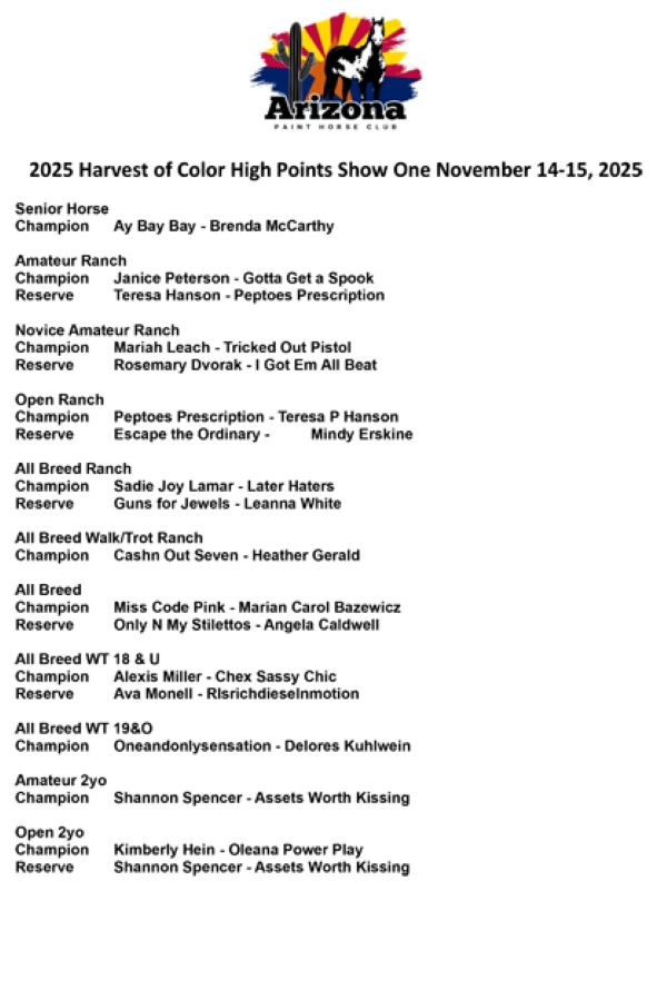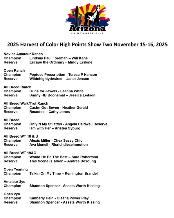November 13-16, 2025, marked the Arizona Paint Horse Club Harvest of Color, at WestWorld of Scottsdale. The club offered two shows with four judges over four days – Show One hosted judges Melissa Dukes and Cindy Weight-Carter, and Show Two hosted judges Sherry Haynes and Delena Doyle.