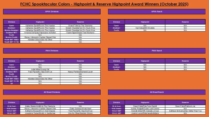 The Florida Color Horse Club just finished up their October Spooktacular Colors, which ran October 24–26, 2025, at Alachua County Agriculture & Equestrian Center in Newberry, FL, with judges Kim Garrett (MO) & Pat Smith (GA).