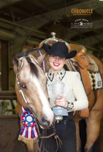An exciting evening followed for Caroline Korell, who made it through a cut, a semi-final, and then took the Golden Globe in the finals rail work with Buck Im Good for the L2 14-18 Western Horsemanship (the largest class at the show), then they turned around and won the L1 14-18 Western Horsemanship Champion of Champions right afterward to finish off the day.