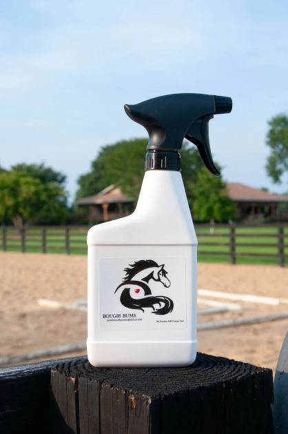 Bring out the shine. Bougie Bums is a premium coat conditioner made with a proprietary castor oil blend designed to nourish the skin and leave your horse’s coat soft, healthy, and radiant. Just shake the bottle and spray—no rinse needed.