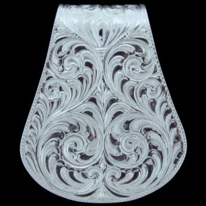 Handmade and hand engraved sterling overlay oval money clip. Made with heavy 16 gauge silver with a nickel back for added strength. 1-3/4″ x 2-1/8″
