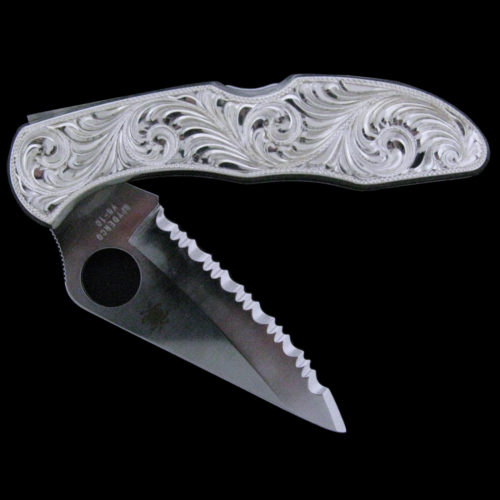 Hand engraved large Spyderco pocketknife covered in sterling silver. The knife features a full serrated blade.