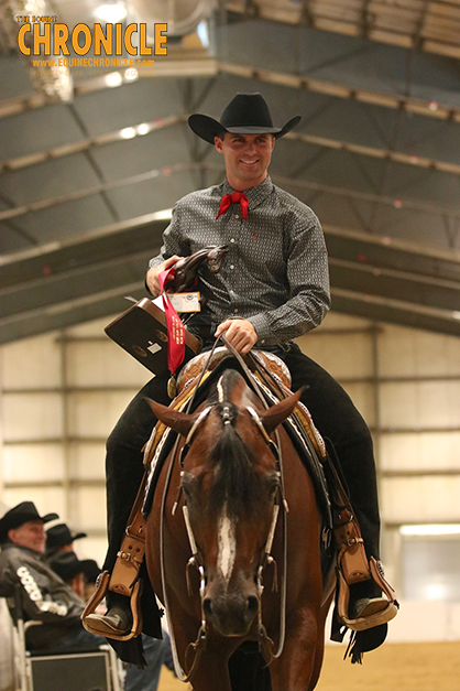 Gil Galyean was in the saddle of The Dark Impulse for Joanie Zelnio to win the $10,000 Open Maturity Western Pleasure. The Reserve Champion was Cody Parrish with Made My Way. Third was Sara Simons with Stylist Chocolate. Fourth was Karen Hornick with RL Sudden Melody. Fifth was Taft Dickerson with Naturally Lazy.