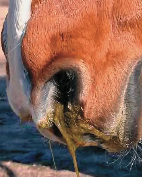 • Feed or saliva draining from the nostrils