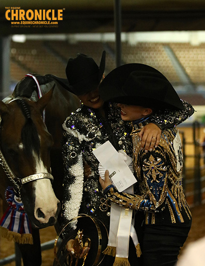 18-year-old Cori and her 16-year-old gelding, “Chuckie,” have been a team for four years, to the day. They compete under the guidance of Nancy Renfro. Cori has been coming to the Youth World for several years, but her highest placing up to this point has been fifth in Horsemanship. This is not only her first win, but her first globe as well. When she learned she was the winner, her response was to climb the arena wall to give her mom, trainer, and best friend all hugs.