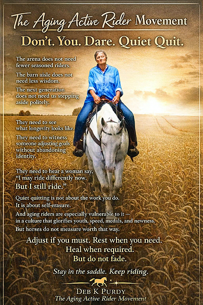 Deb Purdy is the Founder of The Aging Active Rider Movement, a voice dedicated to encouraging and empowering riders to continue their journey in the saddle through the later decades of life. Drawing from a lifetime of lived experience, she writes about longevity, resilience, identity, and the deep, enduring bond between horse and rider. Her work speaks to those who refuse to quietly fade from the equestrian world, offering both practical encouragement and emotional truth. Through her writing and presence, she reminds riders that age does not define the end of their story—but the refinement of it.