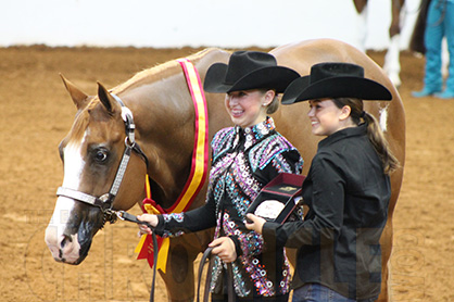 Several familiar faces and a few new ones came to the show pen for the 13 and under and 14-18 Showmanship classes this evening at the 2014 AjPHA Youth World Championship Show. Olivia Eagles scored a unanimous win in 13 and under Showmanship with Chipped In Roses, aka “Brett.” Eagles currently competes under the guidance of Simons Show Horses, as does the Reserve World Champion in the 14-18 division, Mary Camp with Zippos Redemption.