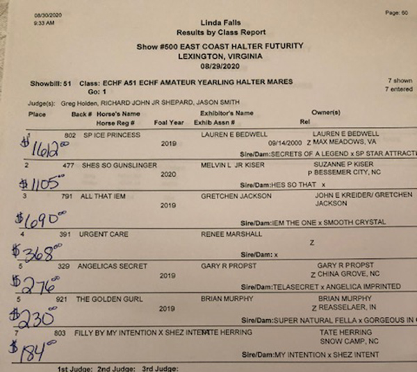 A trademark of the East Coast Halter Futurity is the grassroots feel with personalized, oversized checks that are handmade by Marcy herself, complete with lots of glitter, as well as goody bags stuffed full of treats. “We like for everything to have a personal touch,” Marcy says. “We had many varieties of horse treats; Pepi, Equinity, and dac products; a Harris show halter; a Kathy’s show halter; a recliner; Hands On Gloves; Triple Crown Feed; Tribute hay bags; shampoo, conditioner, hoof picks, and worming paste. We also gave away benches, chairs, Roswell Performance Products, and each WCHA class winner received a wooden cooler that was engraved. The Harris show halter that was donated by Harris Leather and Silverworks and Mike and Stephanie Jennings of Pro Horse Services was won by Suzanne Kaiser.”