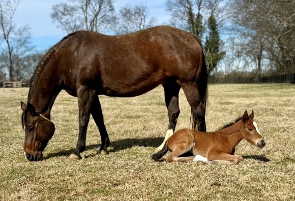 Momma and baby are pictured below, and above is the super colt with their Bernese Mountain Dog, Tula, who loves to be around and watch their foals every year!