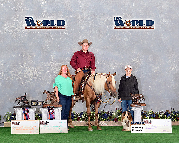 From the 2025 Appaloosa World Championship Show: Buy Breed Win- winner takes all $10,000 added as well as the Levels 1-4 champions – Wimpy Little Norma shown by Seth Kenoyer, owned by Doreen Cawley, and bred by Sidney Karr!