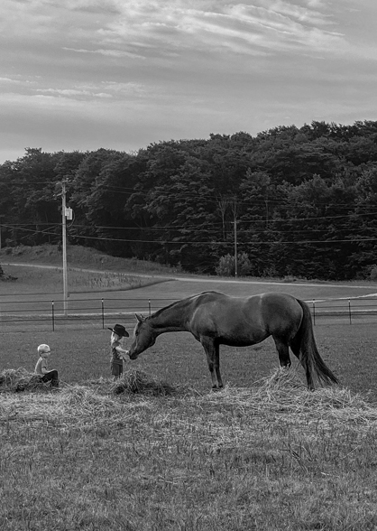 Pictured is Kacey Novak, who insisted on wearing her cowboy hat that morning to feed the horses, while her brother, Wyatt, takes a break sitting on the hay.