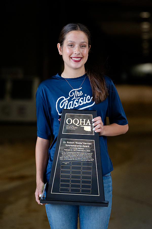 “We’re so proud of her,” says Elizabeth Knabenshue, Emerson’s mom, who wrote these words after the presentation. “Each win, loss, and accomplishment in life is special in one way or another. It teaches us and it inspires us. But today Emerson was recognized for her sportsmanship by her peers and OQHA. She was awarded the Dr. Robie Herman Sportsmanship Award. A Huge Thank You to the Herman Family, the Berryhills, and OQHA. As parents what a moment to see her be recognized for the kind and generous soul she is.”