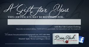 For purchasing details on any of these items, visit www.booyahcustomclothing.com.