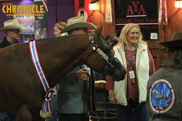 Last year at the AQHA World Show, almost to the day, Gene led Most Appealing Dream to win Performance Halter Mares and claim her fifth World Championship title in a row. The 8-year-old mare, by A Dream Remembered and out of Lil Bit Impulsive, started her winning streak back in 2013 and has continued ever since, winning at the hands of professional horsemen like Luke Castle, Ross Roark, Gene Parker, and now Tom Robertson. Today, “Roxy” won her sixth Open title in a row at the World Show.