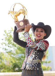 A bridesmaid no more, Natalia DeVencenty has added a golden globe to her collection of bronze trophies. Natalia has four other titles here at the Youth World Show: a bronze and silver in Halter, a bronze in Western Riding, and a bronze in Horsemanship. “I’ve been so close! You know how they say, ‘Always a bridesmaid?’Well, I was never even a bridesmaid; I was the flower girl!”
