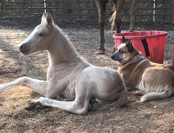 Thankfully, Karla’s red Heeler, Zip, stepped up and took on the job with surprising dedication. “During the morning that it was obvious that the mare wasn’t going to make it, Zip had lain down beside the foal in the alleyway of the barn, whining. Now, he even lies with the foal, lying his head on the foal’s head and neck. Zip loves to come in his stall and just lie there and watch the foal. Zip has never done this with any of our other foals.”