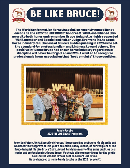 The World Conformation Horse Association recently named Randy Jacobs as the 2025 “BE LIKE BRUCE” honoree. WCHA established this award to both honor and remember Bruce Walquist, a highly respected WCHA member and respected judge.