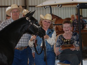 Mary Anne Parris presents a trophy to longtime friends, Dave and Renie Williamson at the Kentucky Breeders Futurity. Image courtesy of Roger Gollehon.