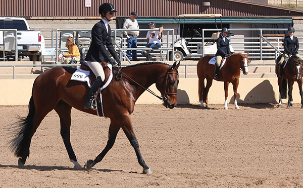 Sun Circuit hosted the NSBA Riders’ Cup on March 6 and 7. A total purse of $75,000 was awarded, along with 29 beautiful silver cup trophies and NSBA medals. The annual event is awarded money in Western Pleasure, Hunter Under Saddle, Trail, Western Riding, Showmanship, Western Horsemanship, and Hunt Seat Equitation events. The large trophy cups were proudly displayed all over the barns at WestWorld after the event. Brody Galyean rode Cool Poco Dot in the All Age Limited Non Pro Western Pleasure to score the top marks in a field of twelve. His giant smile reflected brilliantly in the large Riders’ Cup trophy as he rode out of the arena knowing he earned $1,826.15. Keeping it in the family, Kristin Galyean won the Non Pro Western Pleasure and a check for $1,007.06 riding VS Lady in Red. The pair also took the top spots in Non Pro Western Riding and Junior Western Riding, earning an additional $3,257.