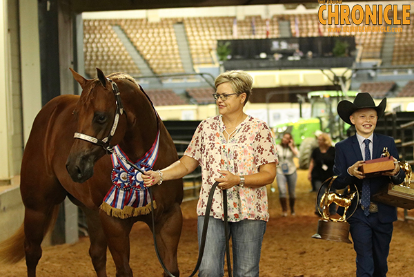 The winner of Performance Halter Geldings was Cooper Dobbs with Mytesly. Cooper and Mytesly have now won this class four years in a row. What’s more, 17-year-old Cooper and 9-year-old “Sly,” still have another year of eligibility left. In his own right, Sly has won more than a dozen World Championship titles in Halter, when he’s not being shown by Cooper’s sister in Barrel Racing that is.