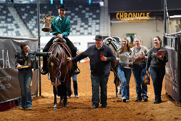 Friday night at the 2025 AQHA World Championship Show, Blake Weis topped the cards to win a Gold Globe and a Silver Globe with AQHA Superhorse Hot Lopin Lily and with Hes N Like Flynn respectively -both full siblings.