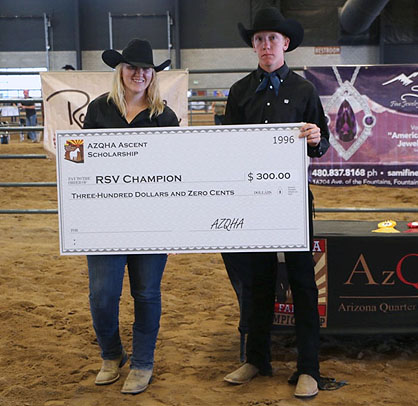 The AzQHA Interscholastic Competition offered classes in Horsemanship and Reining for different levels of experience. Trophies and ribbons were awarded and eligible riders were able to earn scholarship money. Horses were provided at the competition, free of charge, by volunteers and were drawn by exhibitors for each class. Each of the 10 classes at the AZFC show awarded $1,000 worth of Ascent Scholarship money for eligible youth. First place received $500, second got $300, and third place had $200 credited to their account.