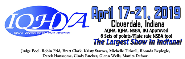 The showbill for the Indiana Quarter Horse Youth Association Show is now online. The show will take place April 17-21 in Cloverdale, Indiana. The judges will be Robin Frid, Brett Clark, Kristy Starnes, Michelle Tidwell, Rhonda Replogle, Derek Hanscome, Cindy Rucker, Glenn Wells, and Manita Defoor.