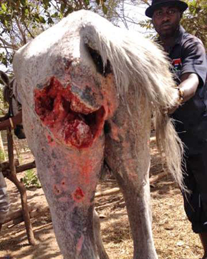“On the road where this man was going with his two kids, there was a landmine,” Jatta says. “By the time the horse crossed, the [wagon] rail went on top of the landmine and then it exploded. From there, the father and his two kids were killed instantly. The horse was injured at the back [left hip]. In four or five days, somebody called us, and we went to see the horse. We hired a lorry [trailer] to bring the horse in and started with treatment. It was very difficult.”