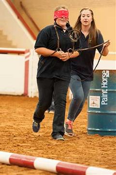 Knowledge Relay: This phase of the competition takes equine knowledge to the next level by having participants navigate through an obstacle course while performing a variety of horse-related activities like tacking up a fake horse or assembling a bridle. Each team consists of up to five members, and participation from each age group—including even the youngest Walk-Trot exhibitors—is encouraged in this fun events that emphasizes the importance of teamwork.