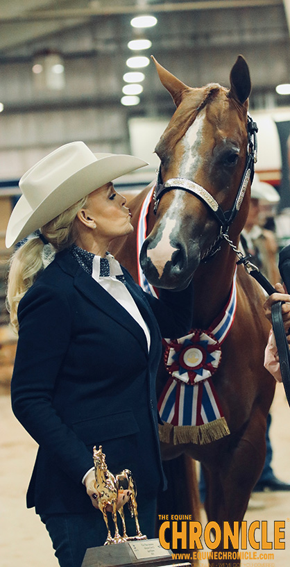 “This is her fifth World Championship. I bought her as a yearling from Joy Stehney, and I just had to have her. She keeps maturing and is more beautiful than ever. She has a beautiful head and tiny, little ears. She’s beautiful bodied but not overdone. If she’s got a hole, I don’t know where it is. I’ve had a lot of good horses, and I’ve had a lot of good mares that I’ve won at the World Show with, but this is absolutely the most beautiful mare I’ve seen.”