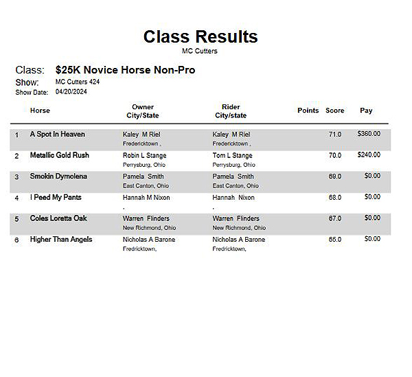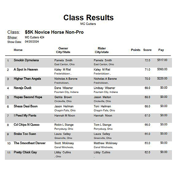 McKinsey Cutting Horses held another successful show in their 2024 cutting series on April 20, 2024, at McCutters Arena in Canal Winchester, Ohio. The judge was Tyler DeLange.