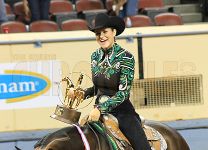 Returning World Champion Deanna Green rode her trusty Palomino mare, Blazinmytroublesaway, to score a 231.5 securing another World Champion title in Western Riding. But, it wasn’t smooth sailing the whole way. After a slight misstep in the preliminaries yesterday, Deanna and “Buttercup” received a second chance at redemption in the shootout round.