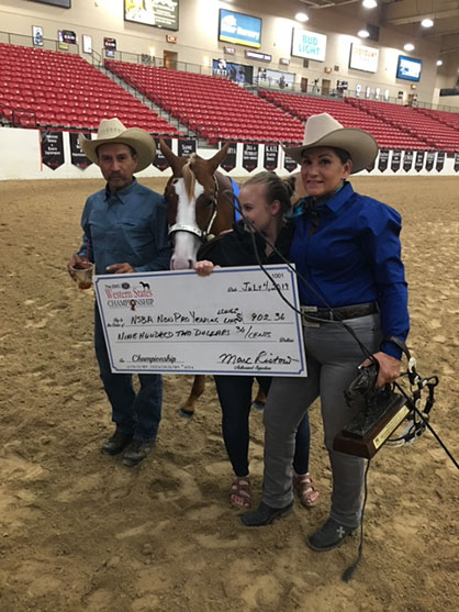 Futurities: Seven, new, NSBA approved futurities were held at The Celebration, including classes for Yearling Longe Line, Western Pleasure, Hunter Under Saddle, and Trail. Thank you to our generous futurity sponsors: Kathryn DeVries Mitchell/Oak Spring Ranch ($2,500 sponsor of the Open Yearling Longe Line class), Angela Clark ($1,500 sponsor of the Non-Pro Yearling Longe Line class), Sandra Morgan ($1,000 sponsor of the 3 and 4-Year-Old Non-Pro Hunter Under Saddle class) and Precision Embroidery/Midge Agsten ($1,000 sponsor for the 3 and 4-Year-Old Trail class). Special thanks to Greenway Saddlery for providing a beautiful English bridle and reins for the winner of 3 and 4-Year-Old Open Hunter Under Saddle class. In addition, our sincerest thanks go to Beth Clemmons for sponsoring the $500 Highest Placing 3-Year-Old award. The futurities were well attended with 13 in the Trail futurity and some of the best horses and trainers in the nation attending. Futurity results can be found on TheCelebrationLasVegas.com.