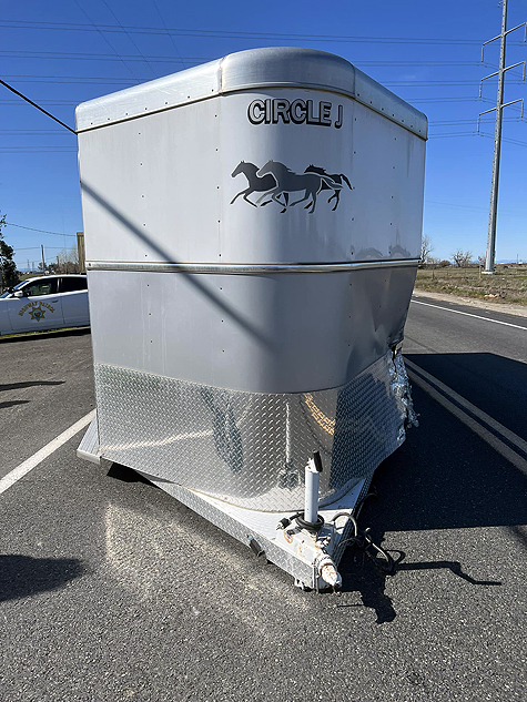 The force of the impact sheered the hitch and separated the trailer from the tow vehicle, crumpling the left side of the trailer, sheering the left front trailer wheel from the axle, and peeling off the left trailer fender. Skid marks on the road showed the trailer hitch gauging the road as it continued another 20-30 feet unattached to the truck. The offending driver’s truck ended up off the road well beyond the trailer.