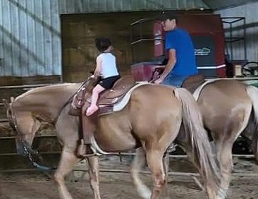 Meet 2-Year-Old Oakley Bickle riding Hot Promises, deep in discussion with Jaxson Scheiderer, who is teaching Oakley how to ride by herself.