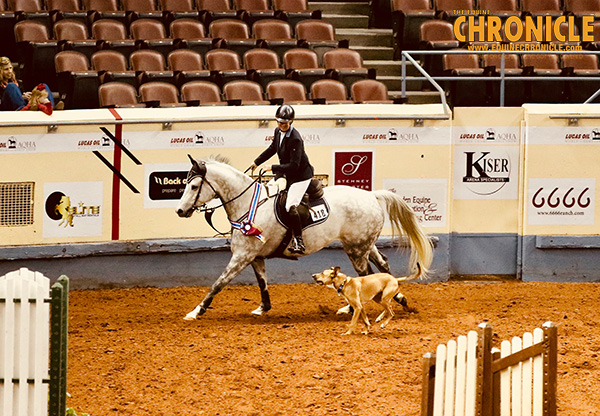 The Best Victory Lap at the AQHA World Show award has to go to Hilary Carrel and Slate OQH with an assist from a very enthusiastic pup, who wanted to participate during the awards of the Jumping class here at the AQHA World Show.