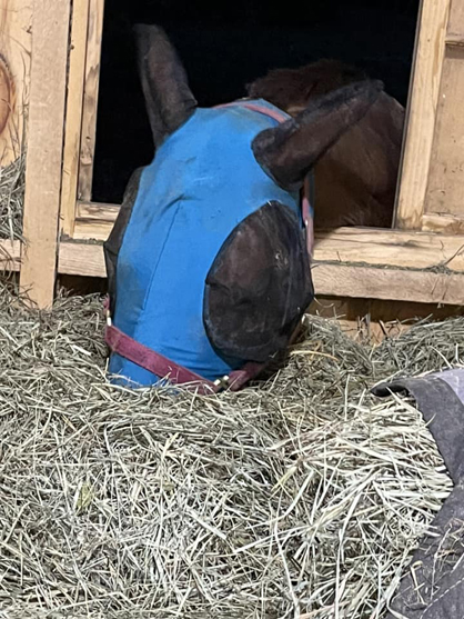 KM Sign Me Up thinks her owner, Patti Cerio, won’t notice her standing at the hay buffet with her fly mask on and her head buried. It seems “Nikki,” aka the hay thief, figured out how to open the window to the feed room after a couple of weeks!