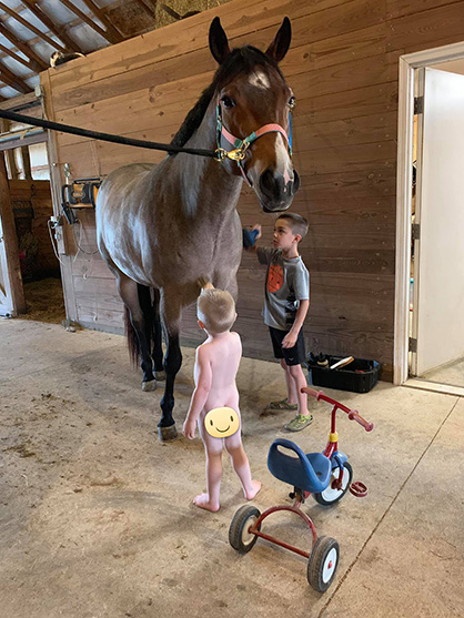 “It was just another day at the barn! These two are only two weeks apart in age and have grown up together. Gidget absolutely loves her kids!”