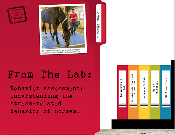 This study tested the combination of two behavior assessment methods to get a deeper understanding of stress-related behavior in horses. Quantitative assessments provide information on the number of times a horse may perform a behavior, while qualitative assessments allow an observer to describe in words the behaviors a horse is exhibiting. We placed horses in each of the four treatments: Standing control in a stall, exposure to an unfamiliar object, electric clippers near the head and neck, and isolation from companion horses in the barn.