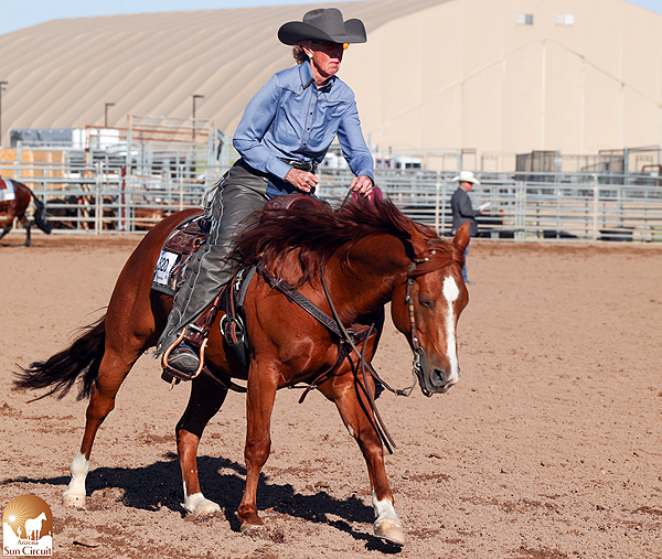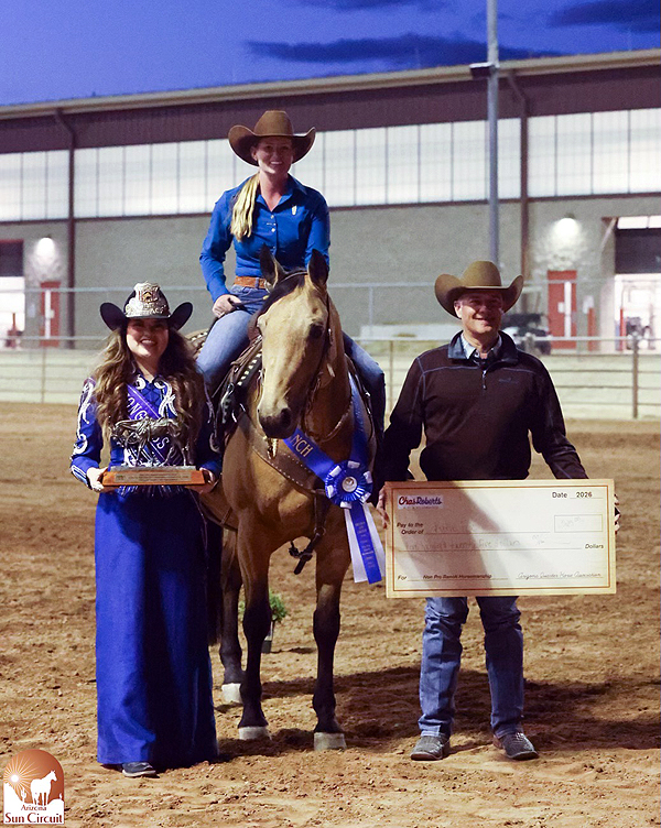 The Chas Roberts NSBA Non Pro Ranch Horsemanship had $1,000 added, but the intrigue and buzz of this new class is what drew 42 entries. With only one go, the class resembled a Ranch Riding pattern with spins, transitions, logs and side passes, but the fundamental difference is that Ranch Horsemanship focuses more on the rider, not the horse. Exhibitors remained around the arena after their runs to support one another in a party-like atmosphere. Katie Fox showed Seismic Reaction to top the field and win $550. Right behind them were Sarah Rose Jons and Inferno Joe, tied with Sydney Weaver and Cocktail Per Se, each receiving $341. Prizes were awarded through 13th and cash paid through 8th place, but all exhibitors felt the excitement of being the first in what will surely become a Sun Circuit favorite.