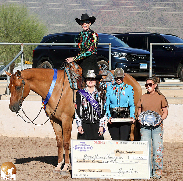 While achieving one’s goals in the arena is a valuable reward, winning cash for those efforts sure makes a show more fun, and this year’s Sun Circuit had plenty of cash to go around. Over $81,000 went to winners in AQHA and NSBA added-money classes, with another $35,700 in AQHA roping. Super Sires brought an additional $14,500 to the table. In addition, 36 saddles were awarded to Circuit and High Point champions along with trophies, silver platters, buckles, pads, Rod Patrick Boots, spurs and champion rings.
