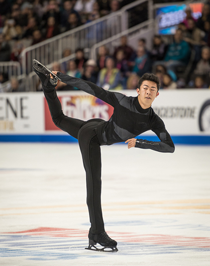 Despite struggling a bit during his first Olympics, Team USA’s Nathan Chen delivered several of his signature looks in solid black with white accents. Understated and elegant with a graphic edge, Chen’s outfits are thoroughly modern, even down to the exposed zippers down the back and on the sleeves. Instead of using different colors and overloading with crystals to attract attention, Chen’s outfits alternate black fabrics to create dimension and interest.