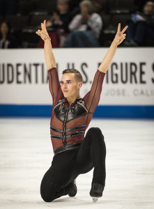 Another one of Rippon’s favorite looks, that he wore last night during the Mens’ Short Program, was a burgundy and black number with black leather reverse cutouts and crystal edge detailing. This piece utilized three trends- mesh, graphic lines, and strategic, reverse cutouts. According to a piece on USA Today Sports, this outfit cost $1,200 and was created by his friend and Los Angeles designer Braden Overett.