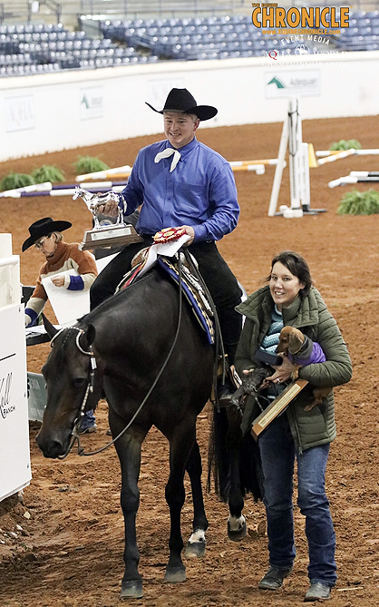 On Thursday, November 9th at the 2023 AQHA World Championship Show, Valerie Kearns won a Gold Globe in L2 Senior Trail on FirstOneInLastOneOut for owner Patricia Bogosh.