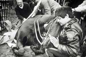 The Story Behind the Photo: Nearly 25 years ago, Police Officer Frank Pomodoro found himself comforting his partner and police horse, Fritz, who had fallen into a sidewalk construction hole that had been covered over by a steel plate just outside the old District D-4 station which, at the time, was located in the area of Berkeley Street and Warren Ave. Pomodoro was inside the station when someone came running in and told him that his horse had fallen into a hole. When Pomodoro got outside, he immediately feared the worst, a broken leg and he knew that his partner of three years would have to be put down. In fact, according to Pomodoro, the one question he hears more often than any other when people reference the picture of his horse in the hole is whether or not Fritz survived the fall. In response to that question, Pomodoro gratefully offers the following, “He was back to work in three weeks and, luckily, he only suffered a cut to one of his front legs.”